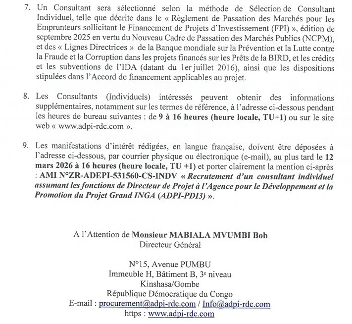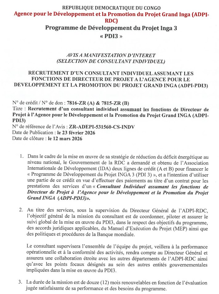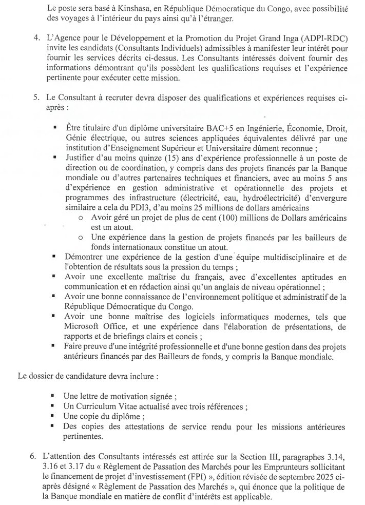 Groupe CIDE: Directeur de projet à l’Agence pour le Développement et la Promotion du Projet Grand Inga (ADPI-PDI3) mars 5, 2026 / Par David Zebo / Laisser un commentaire Lieu : Kinshasa Organisme : UCM Description Veuillez laisser ce champ vide 100% Gratuite Restez informé des dernières bourses, formations, appels à projets et initiatives solidaires. Une newsletter engagée pour ceux qui veulent agir et réussir. Nous ne spammons pas ! Consultez notre politique de confidentialité pour plus d’informations. Vérifiez votre boite de réception ou votre répertoire d’indésirables pour confirmer votre abonnement.