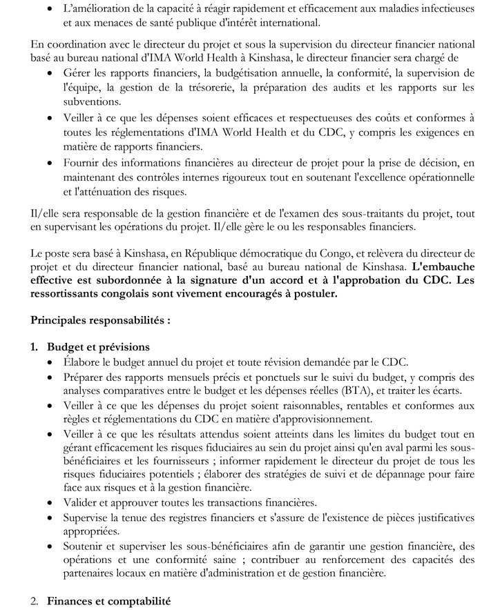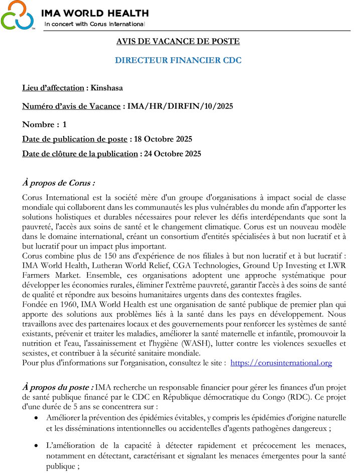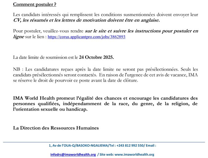 Directeur Financier octobre 22, 2025 / Par David Zebo / Laisser un commentaire Lieu : Kinshasa Organisme : IMA World Health Description Veuillez laisser ce champ vide 100% Gratuite Restez informé des dernières bourses, formations, appels à projets et initiatives solidaires. Une newsletter engagée pour ceux qui veulent agir et réussir. Nous ne spammons pas ! Consultez notre politique de confidentialité pour plus d’informations. Vérifiez votre boite de réception ou votre répertoire d’indésirables pour confirmer votre abonnement.