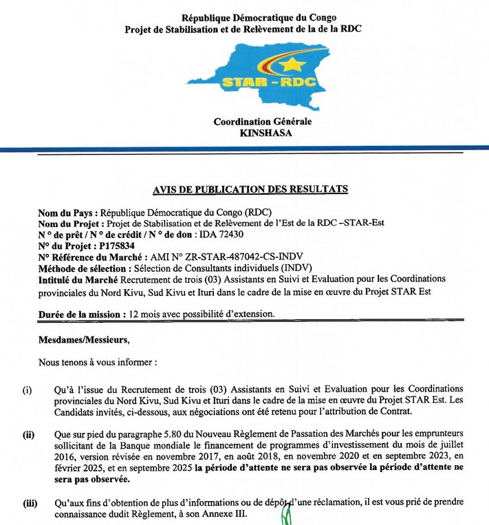 Groupe CIDE: Assistants en Suivi et Evaluation pour les Coordinations provinciales du Nord Kivu, Sud Kivu et Ituri dans le cadre de la mise en œuvre du Projet STAR Est mars 5, 2026 / Par David Zebo / Laisser un commentaire Lieu : Nord Kivu, Sud Kivu et Ituri Organisme : STAR-Est Description : Veuillez laisser ce champ vide 100% Gratuite Restez informé des dernières bourses, formations, appels à projets et initiatives solidaires. Une newsletter engagée pour ceux qui veulent agir et réussir. Nous ne spammons pas ! Consultez notre politique de confidentialité pour plus d’informations. Vérifiez votre boite de réception ou votre répertoire d’indésirables pour confirmer votre abonnement.