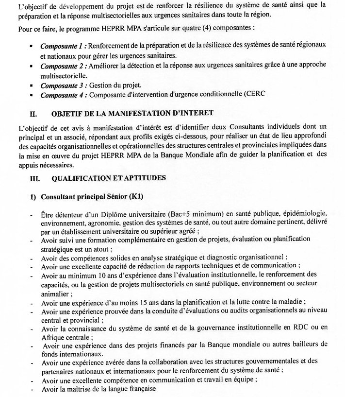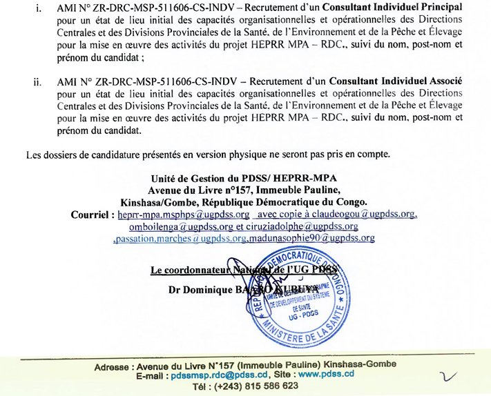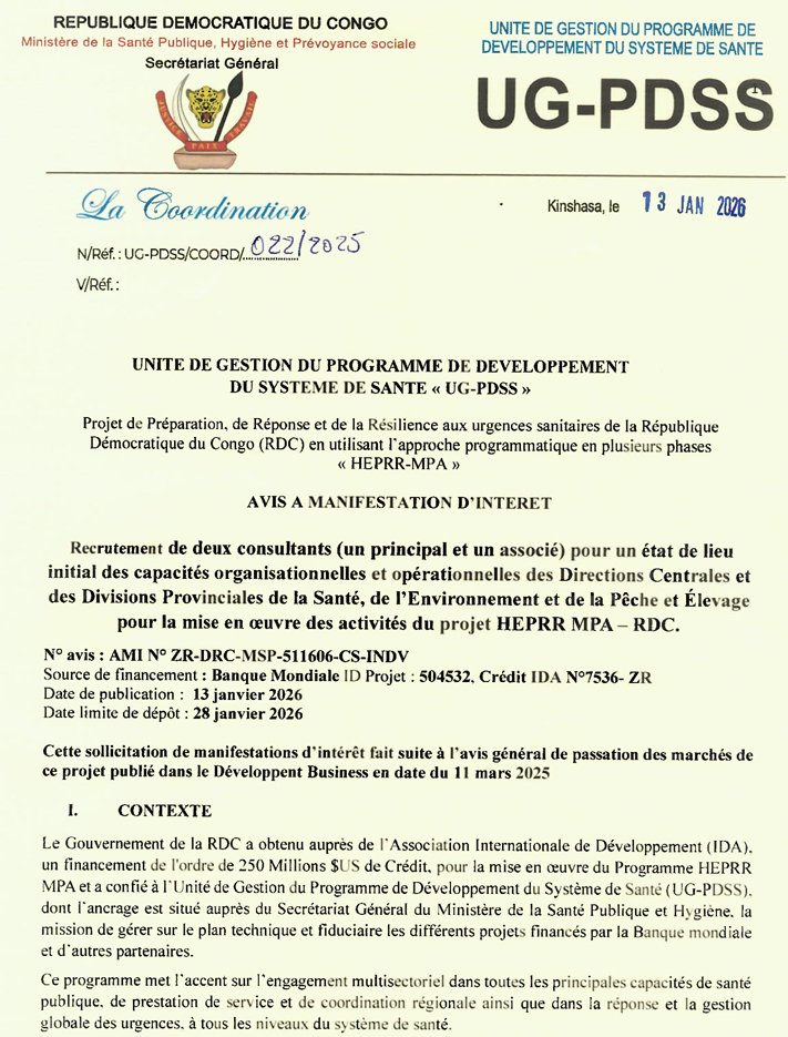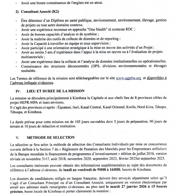 Groupe CIDE: Deux Consultants (un principal et un associé) pour un état de lieu initial des capacités organisationnelles et opérationnelles des Directions Centrales et des Divisions Provinciales de la Santé, de l’Environnement et de la Pêche… janvier 15, 2026 / Par David Zebo / Laisser un commentaire Cliquez ici pour télécharger le TDRs-MS WORDTélécharger Veuillez laisser ce champ vide 100% Gratuite Restez informé des dernières bourses, formations, appels à projets et initiatives solidaires. Une newsletter engagée pour ceux qui veulent agir et réussir. Nous ne spammons pas ! Consultez notre politique de confidentialité pour plus d’informations. Vérifiez votre boite de réception ou votre répertoire d’indésirables pour confirmer votre abonnement.