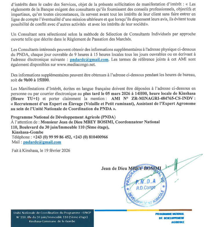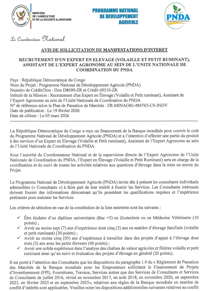 Groupe CIDE : Expert en Elevage (Volaille et Petit ruminant), Assistant de l’Expert Agronome au sein de l’Unité Nationale de Coordination du PNDA